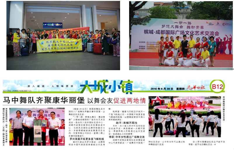 “一带一路 梦想大舞台 舞动青春 槟城--成都国际广场舞文化艺术交流演出会”于2016年6月28日在马来西亚槟城洲乔治市(即槟岛)康华丽堡文艺演出中心举行。四川大学金秋艺术团舞蹈队的广场舞“夕阳之美”和“小苹果”参加了此次交流演出。