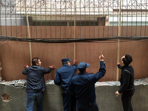 图为 工人连夜恢复小区围墙