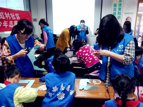 图为 志愿者协助小朋友制作护绿爱心卡片