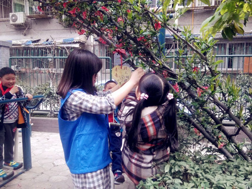 图为 志愿者将护绿爱心卡片挂在树上