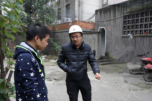 图为 施工方现场对房屋承租人说明房屋隐患情况