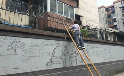 图为 小区工作人员正在对排查出来的安全防范薄弱墙体安装防盗网