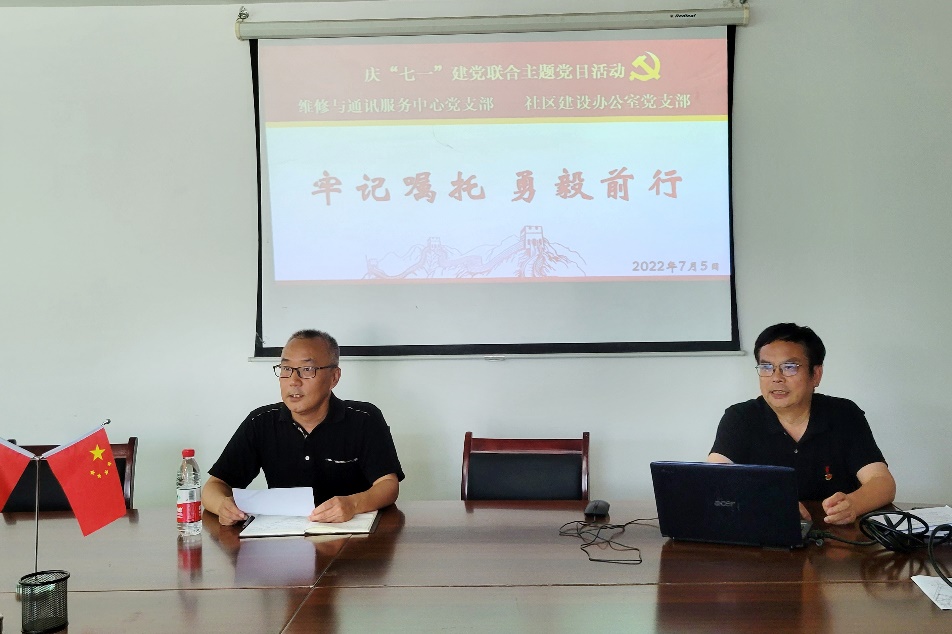 为庆祝建党101周年,迎接党的二十大顺利召开,丰富党员组织生活,提升党员荣誉感,提高党组织的凝聚力和号召力,建设基层服务型党组织,维修与通讯服务中心党支部和社区建设办公室党支部联合开展庆“七一”建党日主题活动。活动由后勤保障部党委委员周密副部长主持。